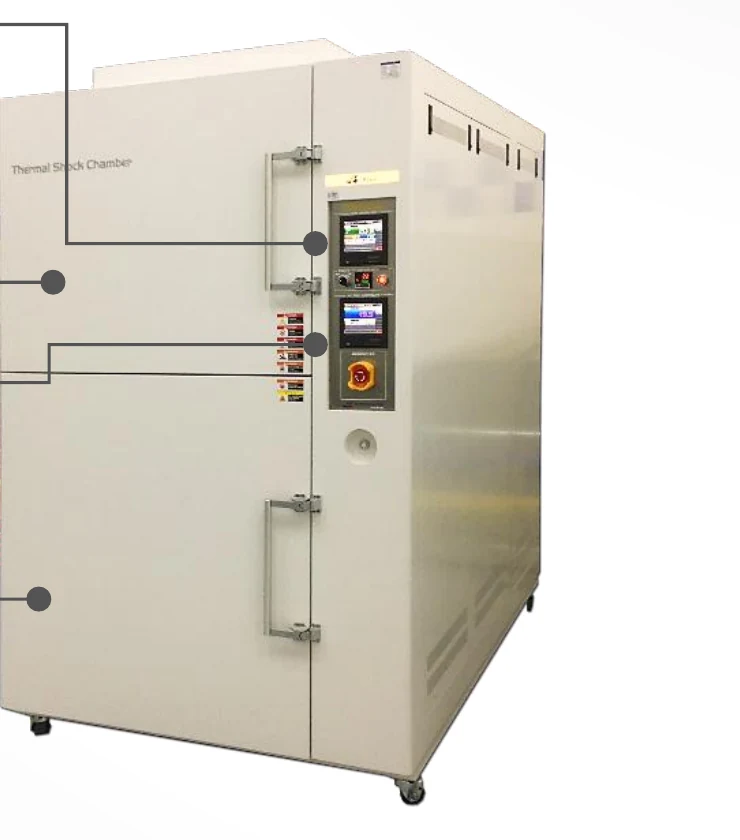 Tủ sốc nhiệt kiểu Elevator 2 vùng — mẫu di chuyển lên xuống giữa vùng nóng và vùng lạnh. Panel nhôm dày 5T, khe 7 mm cho phản ứng nhiệt tối ưu.